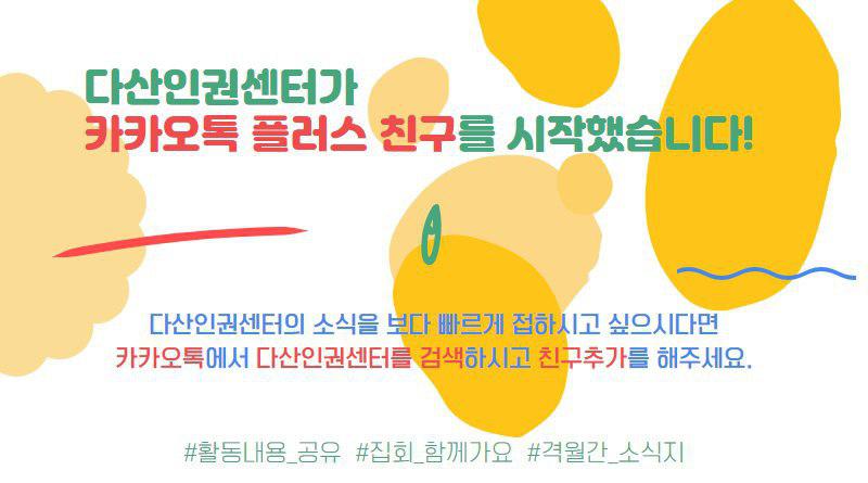 http://pf.kakao.com/_QWyxmj 로 들어가셔서 '친구추가' 하시면 다산인권센터와 친구가 되실 수 있습니다. 친구 추가 많이많이 해주세요^^