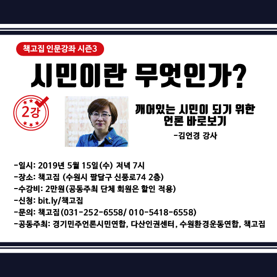 지난 수요일 다산인권센터, 경기민주언론시민연합, 수원환경운동연합, 책고집이 공동기획한 인문학 연속 강좌 그 첫 번째 시간이 진행되었습니다.