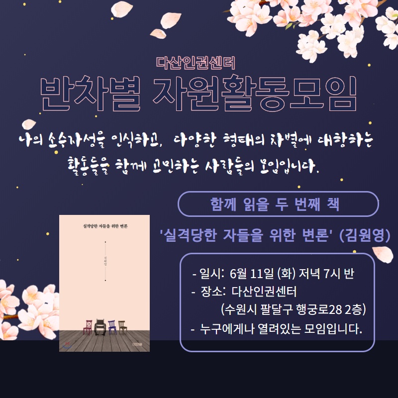 나의 소수자성을 인식하고, 차별과 혐오에 맞서기 위한 대항력을 키우는 반차별모임에 함께 해요.