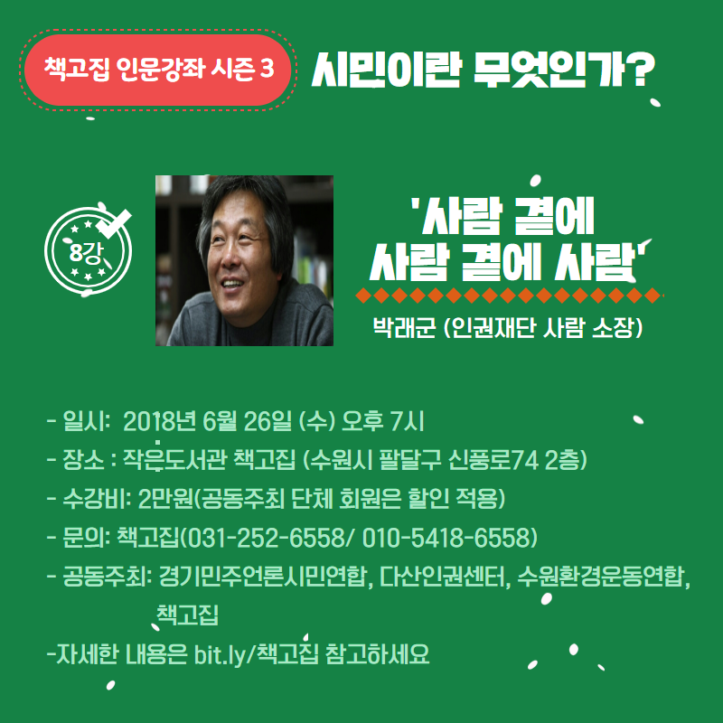 다음 주는 '시민이란 무엇인가?' 마지막 강의가 있습니다. 인권재단 사람의 박래군 소장님을 모시고 '사람 곁에 사람 곁에 사람'이라는 제목으로 강의 듣습니다.