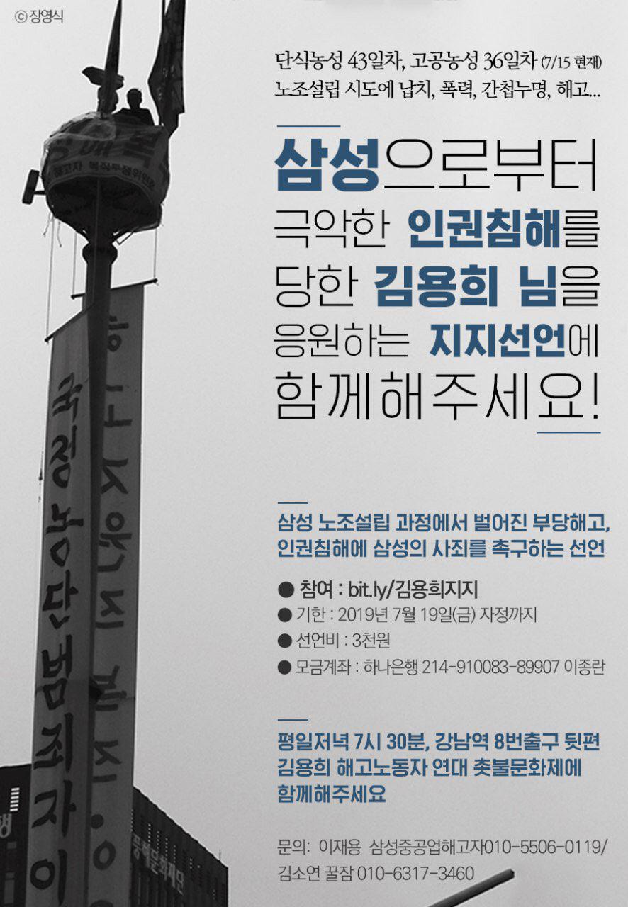 이 노동자에게 남은 시간이 얼마 없습니다. 김용희 님께서 하루 빨리 철탑외에서 내려와 건강을 되찾을 수 있도록 평일 저녁 7시 반, 강남역 8번 출구 뒤에서 열리는 연대 촛불문화제에 많이 참여해 주시고, 김용희 님을 응원하는 지지선언에도 함께 해주시기를 요청 드립니다.
