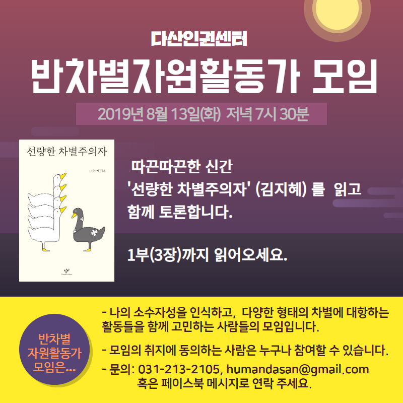 | [초대합니다]반차별 자원모임, 두 번째 책 읽습니다. (0) | 2019.06.05 |