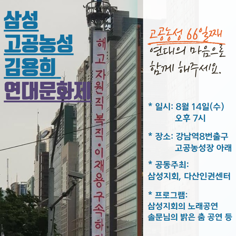 다산인권센터와 삼성지회가 김용희 님을 위한 연대문화제를 준비했습니다. 다음 주 수요일 저녁입니다.