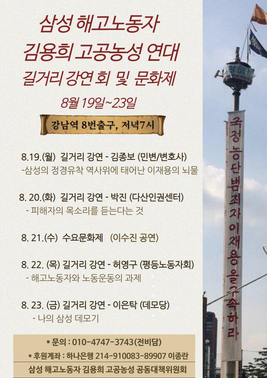 8.19~23 삼성해고노동자 김용희 고공농성 연대 길거리 강연회 및 문화제 일정