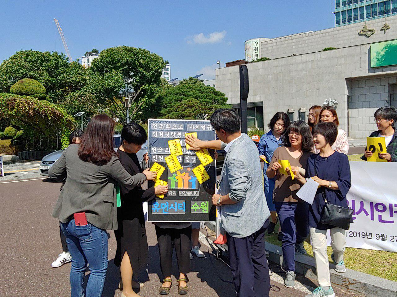 기자회견 중 진행된 퍼포먼스에서 활동가들은 수원시의 인권관련 업적을 정리해 둔 판넬에 경고장을 붙이며, 하루빨리 인권기본조례 개정안을 통과시키기를 촉구했습니다. 만약 개정안이 빠른 시일 내에 통과되지 않을 경우 다음번에는 경고만으로 그치지 않을 것이라고 말했습니다.