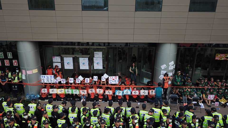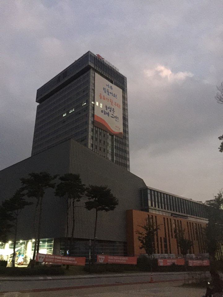 이후 김천 도로공사에 도착했는데, 건물 벽면에 너무나도 크게 걸려있는 현수막의 문구를 보고 완전 뜨악 '너무 힘들어요! 동료가 될 우리, 농성은 이제 그만!' 동료가 될 사람들을 인간이하로 취급하고 있는 것이 누구인데, 어떻게 저런 현수막을 걸 생각을 했을까 이해가 되지 않았습니다.