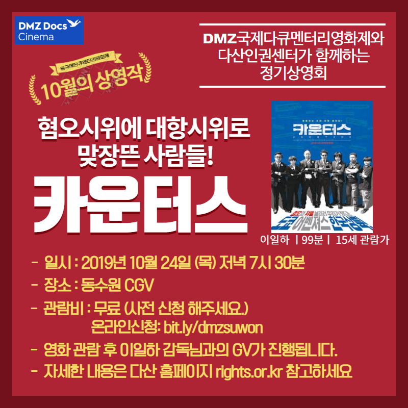 다산인권센터가 10월, 11월 두 달간 DMZ국제다큐영화제와 함께 정기상영회를 진행합니다.