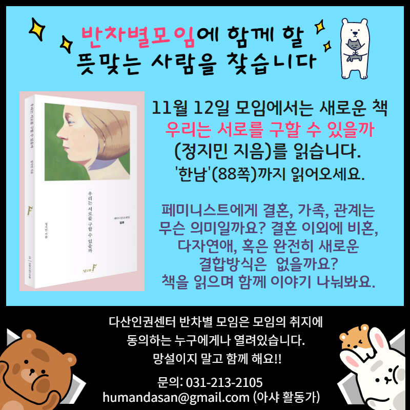 다음 모임은 11월 12일 저녁 7시 반(다산인권센터)에 진행합니다. 새로운 분들도 언제나 참여 가능하니 부끄러워하지 말고 반차별 모임에 함께 해요.