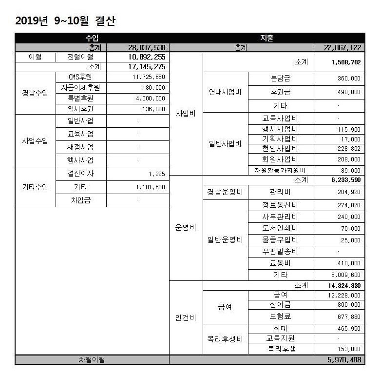 다산인권센터 2019년 9~10월 재정 결산 내역입니다.