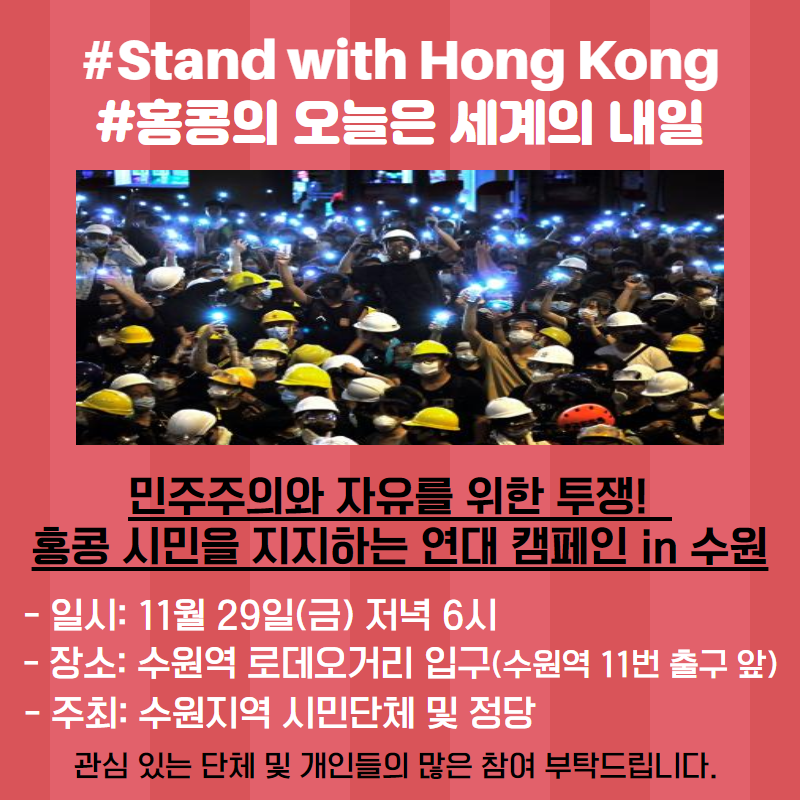그래서 내일 저녁 6시 수원역 로데오 거리에서 홍콩시민과 연대하고, 그들에게 지지 메시지를 보내는 캠페인을 진행하려고 합니다. 그들의 오늘이 한국의 오늘, 그리고 내일과 무관하지 않음을 시민들에게 알리고, 홍콩 시민들의 투쟁에 연대하고자 합니다. 많은 참여 부탁드립니다.