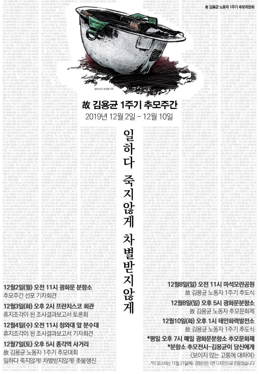12월 2일 추모주간을 선포하고 12월 10일까지 추모의 시간, 자리가 이어집니다. 12월 7일 토요일 일하다 죽지 않고, 차별받지 않는 세상을 만드는 촛불행진에서 많은 분들 함께 걸으면 좋겠습니다.