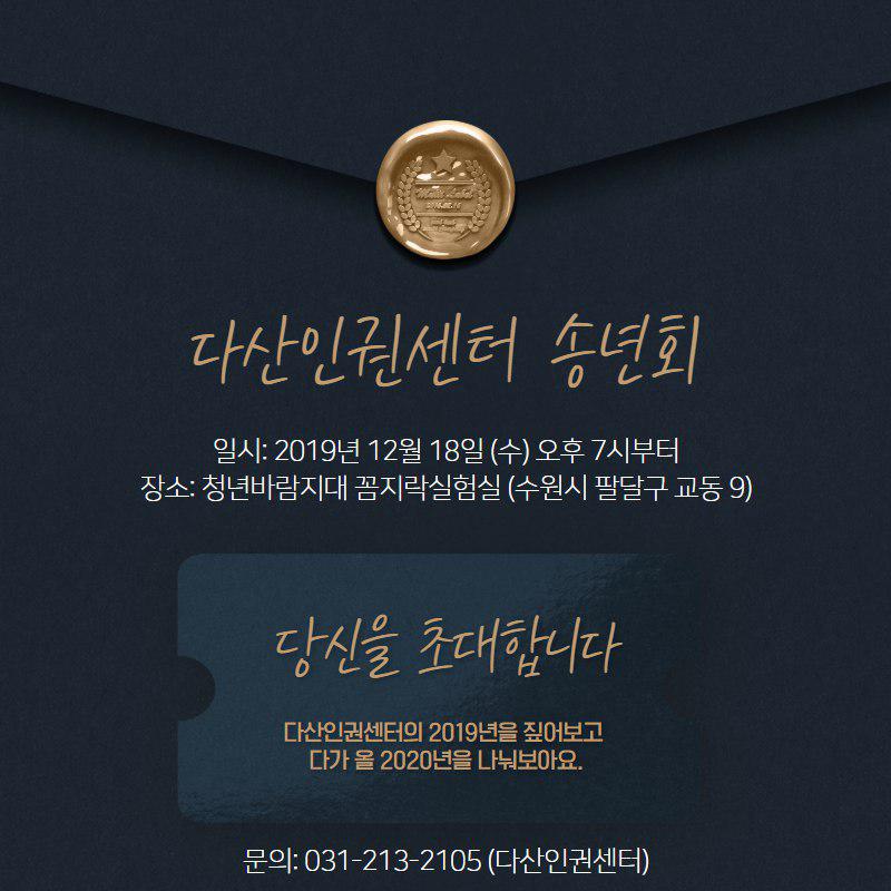 2019년 12월 18일 (수) 오후 7시, 청년바람지대 꼼지락실험실 (수원시 팔달구 교동 9)에서 다산인권센터 송년회가 진행될 예정입니다.