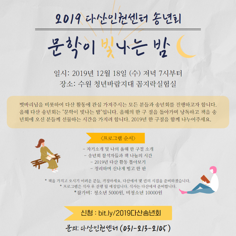 벗바리님을 비롯하여 다산 활동에 관심 가져주시는 모든 분들과 송년회를 진행하고자 합니다. 올해 다산 송년회는 "문학이 빛나는 밤"입니다. 올해의 한 구 절을 돌아가며 낭독하고 책을 송년회에 오신 분들께 선물하는 시간을 가지려 합니다. 2019년 한 구절을 함께 나누어주세요.