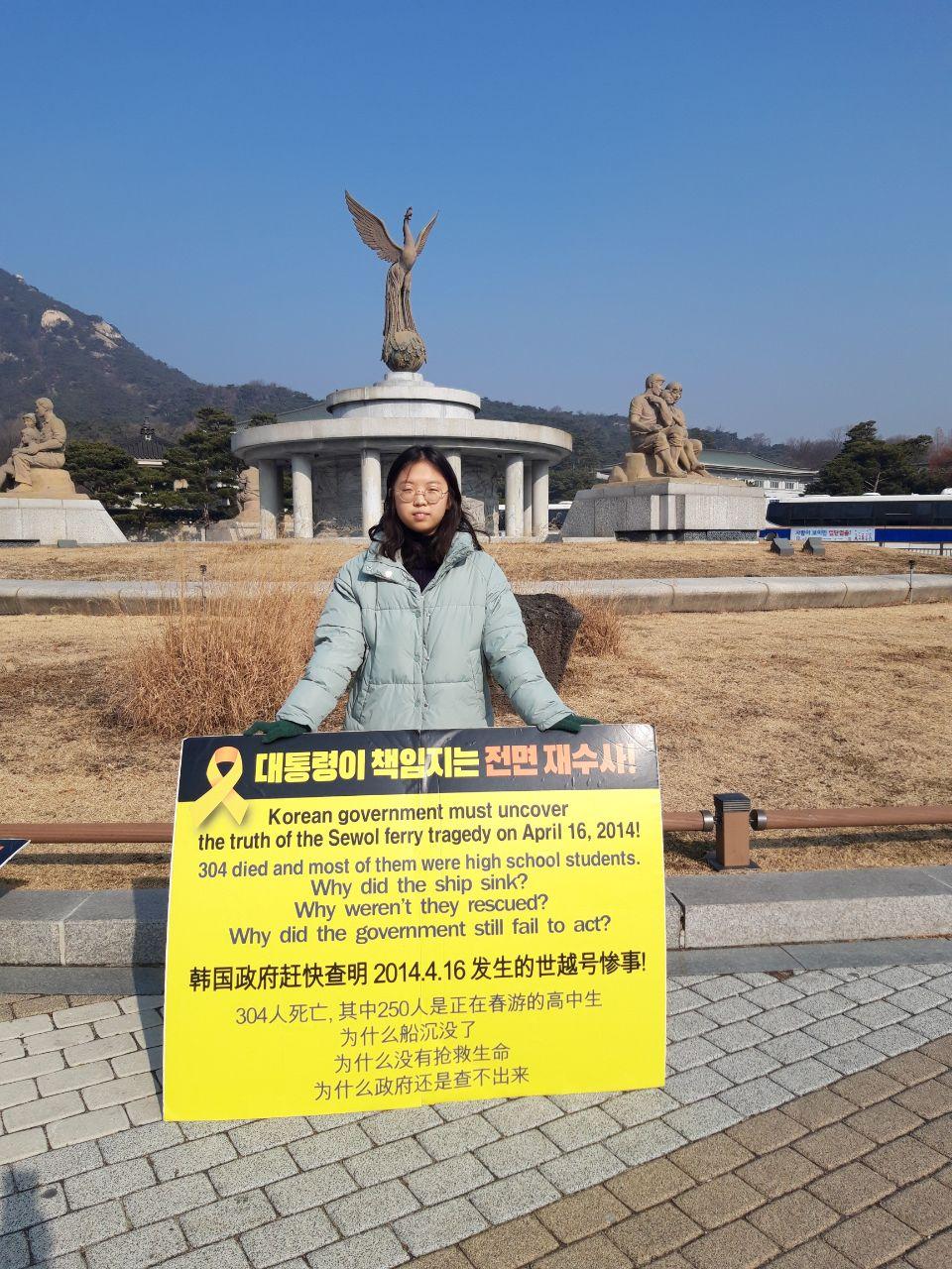 지난 번에 이어 다산의 자원활동가 별님도 함께 했습니다. 피켓팅을 하는 2시간 동안 적어도 500명은 넘는 중국관광객들이 우리 앞을 지나갔는데요, 중국어가 적혀있는 피켓을 보자 뭐라뭐라고 질문을 하더라구요. 바로 그때 중국어에 능통한 별님이 그들의 질문에 척척 대답을 해줬습니다. 나중에 물어보니 거의 대부분 왜 2014년에 일어난 일이 아직까지 진실규명이 되지 않았는지를 물어봤다고 하네요. 그러게요... 정부가 처음부터 제대로 했다면 국민들이 6년이 지난 이 겨울까지 피켓팅을 할 필요가 없었겠죠.