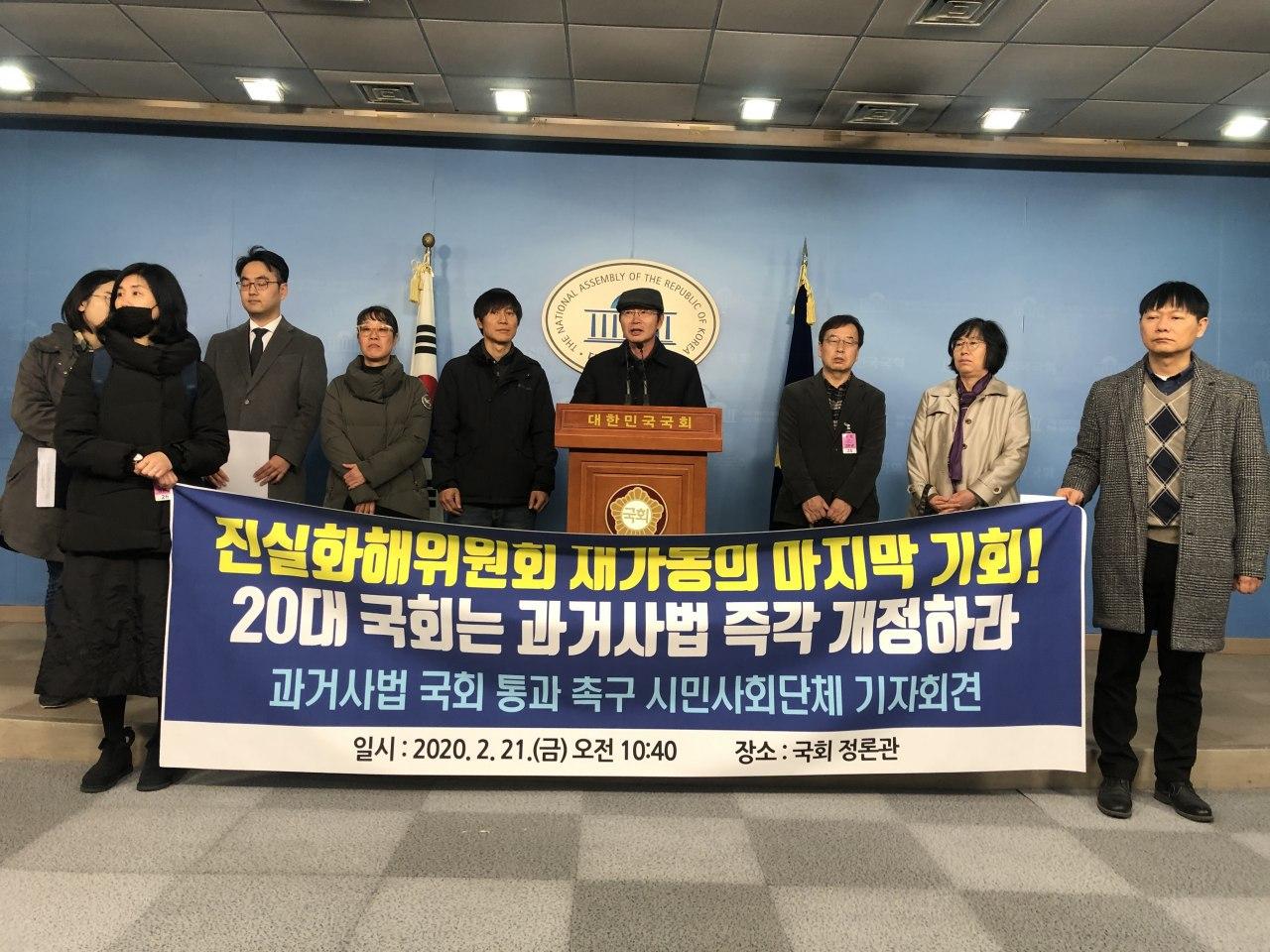 총선을 앞두고 20대 국회 마지막이 될 2월 임시국회가 열렸다. 한국전쟁기 민간인 학살, 형제복지원과 선감학원, 서산개척단 등 국가폭력 사건의 진상규명과 명예회복을 위해 과거사법 개정안 처리를 요구해온 우리는 그 어느 때보다도 절박한 마음으로 이 자리에서 섰다. 국회 행안위에 방치되었던 개정안은 지난해 10월 자유한국당을 제외한 여야 합의로 9년 만에 행안위 문턱을 넘었다. 그러나 자유한국당(현 미래통합당)의 몽니로 이제는 법사위에 묶여 버렸다. 이대로라면 개정안은 국회 회기 만료로 폐기되고야 말 것이다.