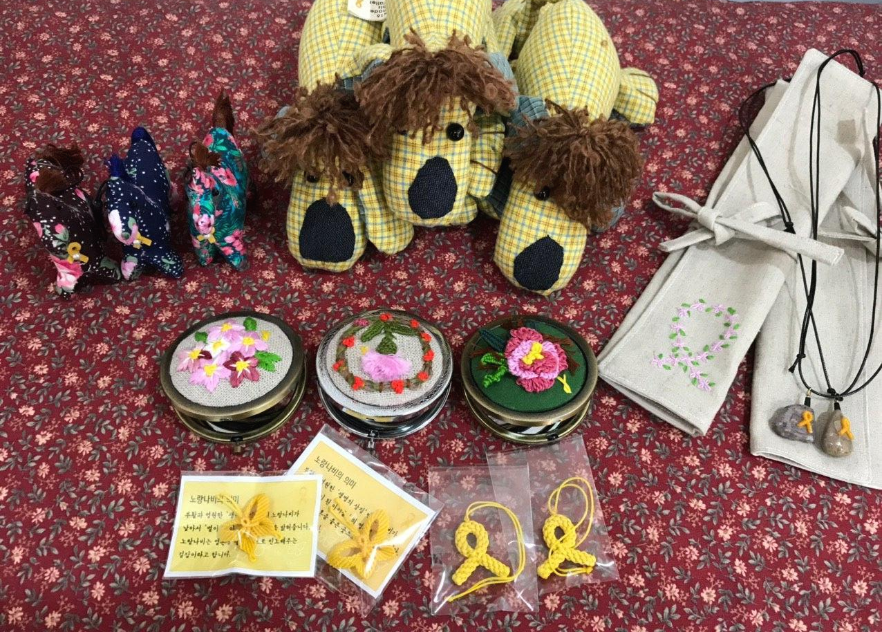 움직이는 4.16 기억의 공간에서는 4.16 공방에서 세월호 어머니들이 직접 만드신 제품도 판매하고 있습니다. 손목쿠션, 수저집, 커버에 직접 수를 놓은 손거울, 팽목항에서 가져돈 조약돌로 만든 목걸이 등이 있습니다. 공방 제품에도 많은 관심 바랍니다.