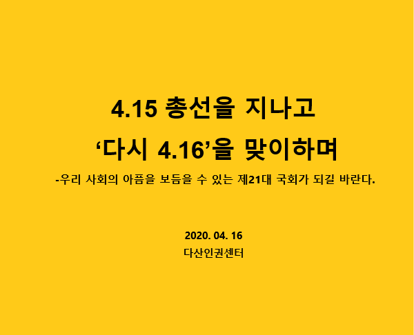 다산인권센터는 세월호참사 6주기 희생자와 유가족, 최근 코로나 19로 인해 아픔을 겪는 모든 이들에게 위로를 전하며, 21대 국회가 인권과 존엄이 기반 된 정책을 만들도록 지속적으로 촉구하며, 감시할 것이다.