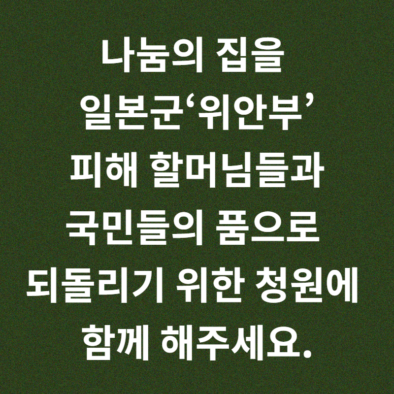 이제라도 나눔의집의 비리 의혹을 명명백백하게 밝히고, 일본군 ‘위안부’ 피해 할머님들의 수많은 기록과 유품 그리고 기억들로 가득 차 있는 나눔의집을 할머니들과 국민의 품으로 제대로 되돌려야 합니다. 청원에 함께 해주시기를 요청 드립니다.