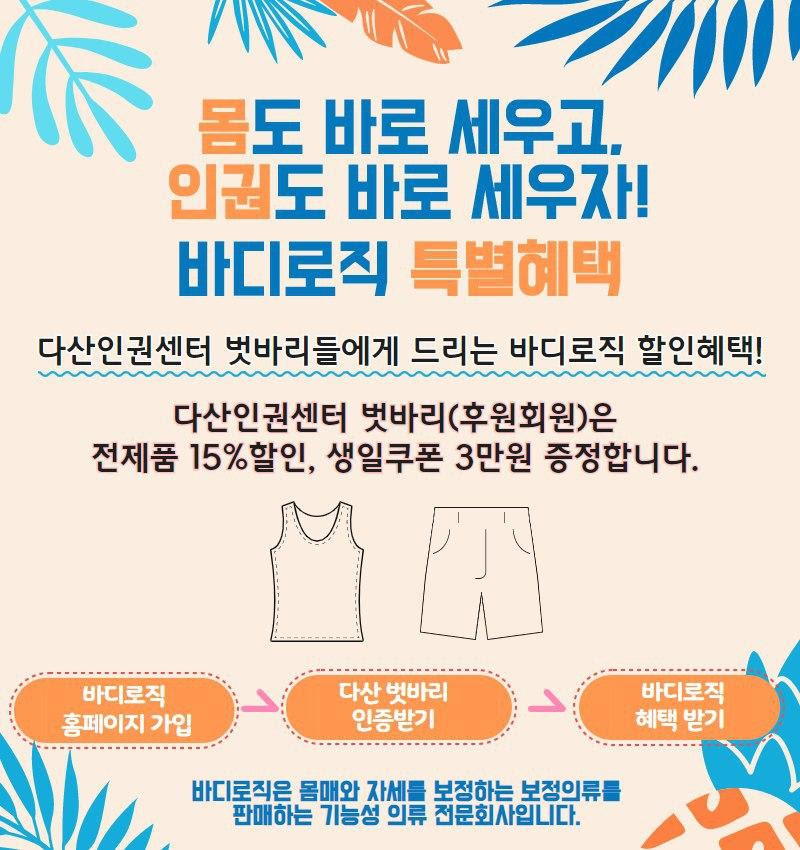 바디로직은 인체공학적 설계로 거북목 및 굽은등 자세개선을 위한 기능성 의류를 판매하는 기능성 의류 전문회사이자 다산인권센터를 비롯하여 다양한 시민사회단체를 후원하고 있는 기업입니다.