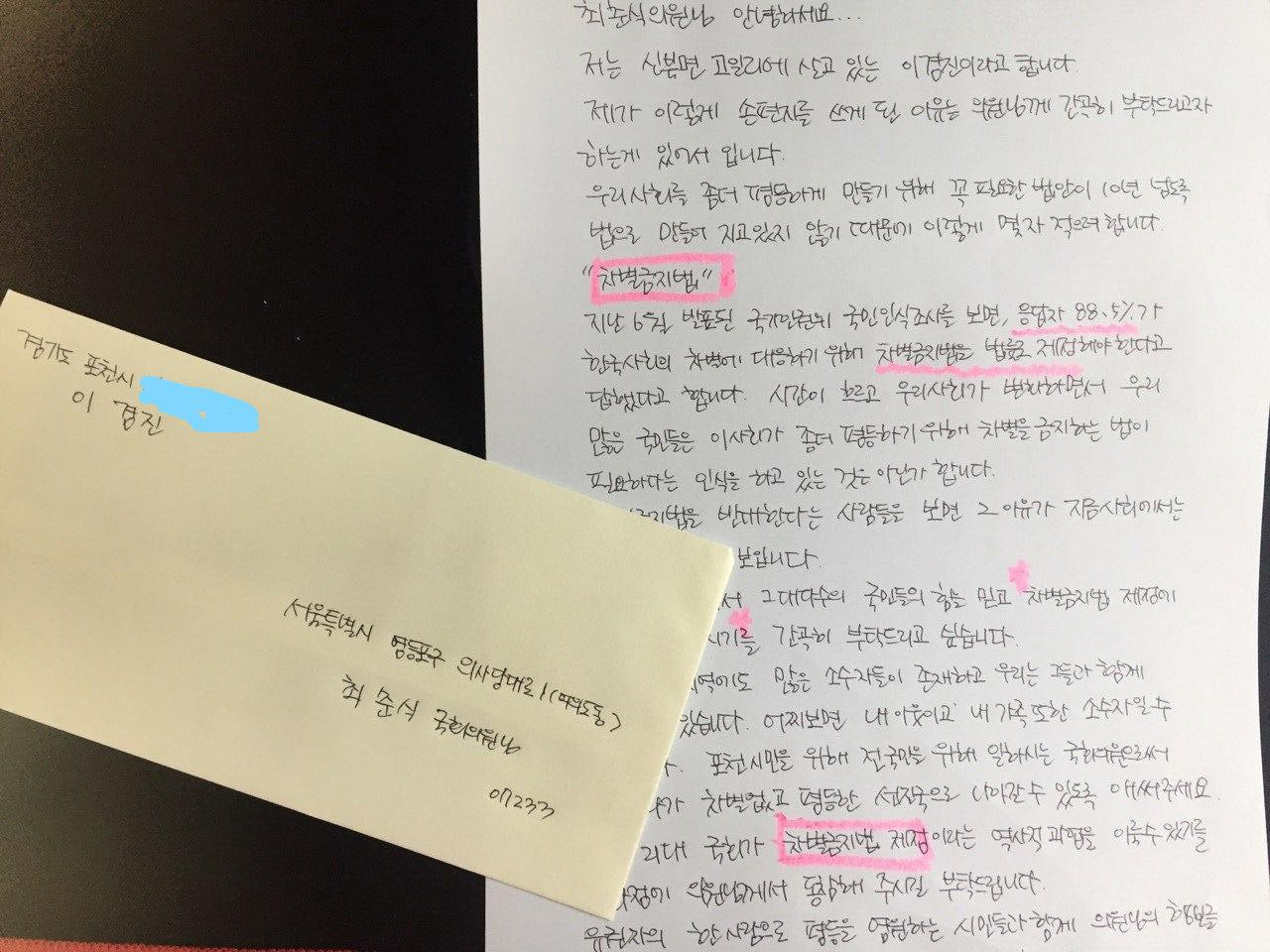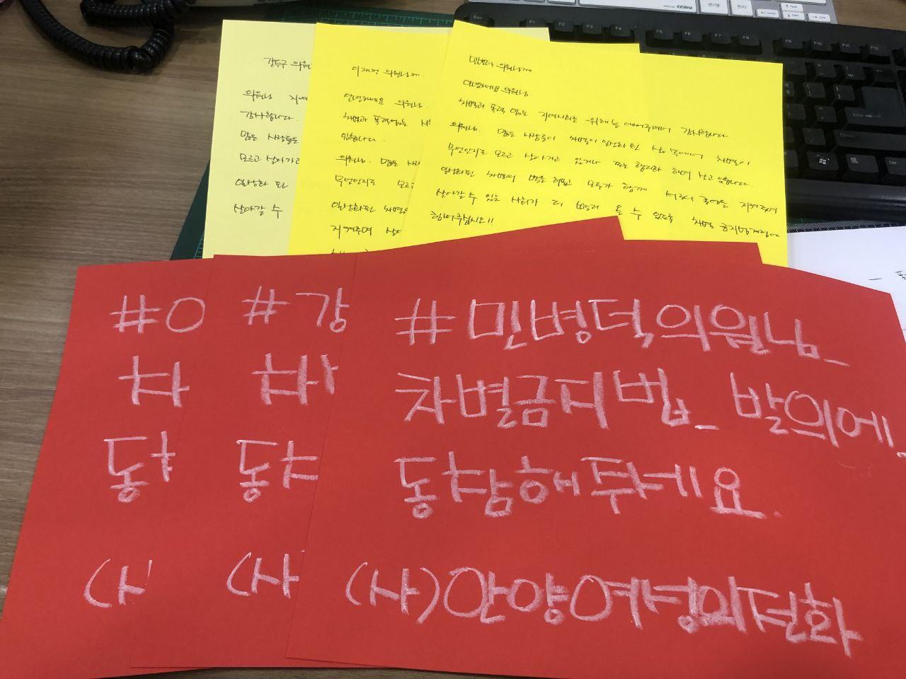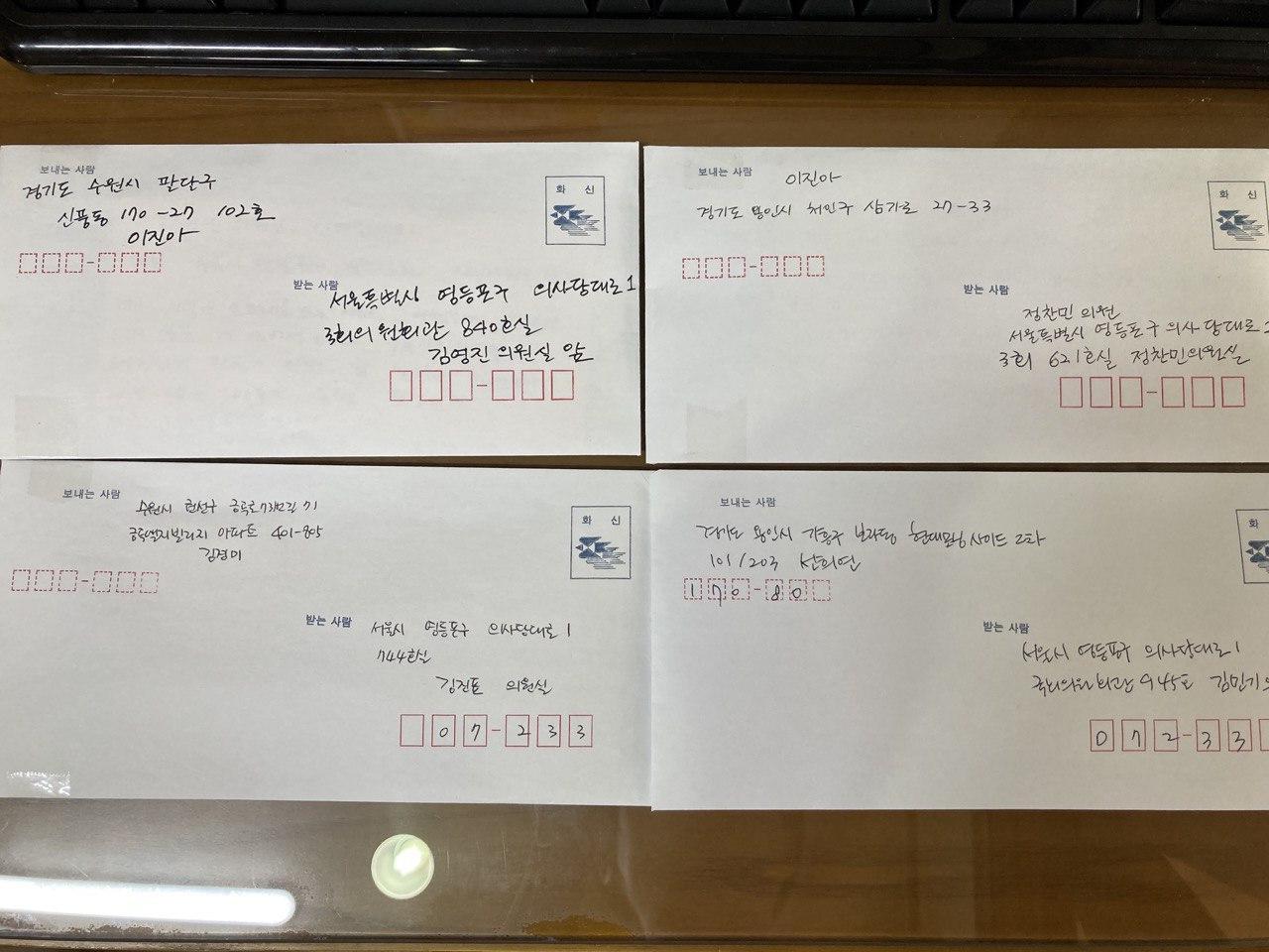 모든 분들이 차별혐오선동세력의 문자 및 전화폭탄을 상쇄하고도 남을만큼의 정성을 들여 한 글자, 한 글자 편지를 써주셨습니다. 다산에서도 수원 지역구 국회의원들에게 편지를 써서 부쳤습니다. 이 편지를 받은 의원들이 평등한 세상을 향한 큰 걸음에 함께 발을 맞추어 줄 것이라고 기대합니다.