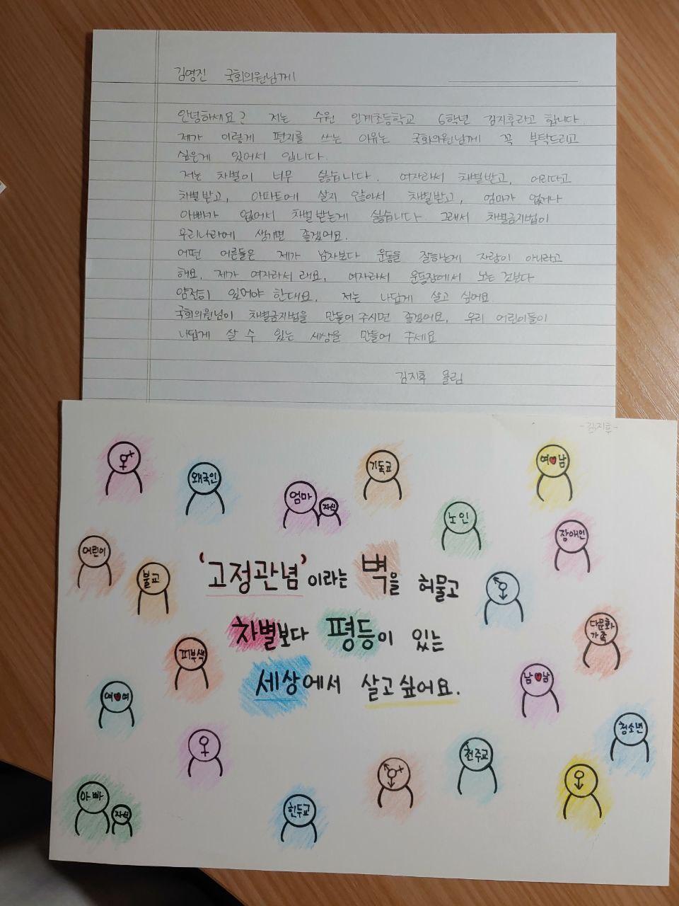 손 편지가 부담스러운 분은 국제 엠네스티 홈페이지에서 본인의 지역구만 입력하면 자동으로 국회의원에게 이메일을 보내는 캠페인에 함께 하실 수 있습니다. https://act.amnesty.or.kr/equalityact/?_ga=2.28269244.1094255.1599726165-109858592.1597282151
