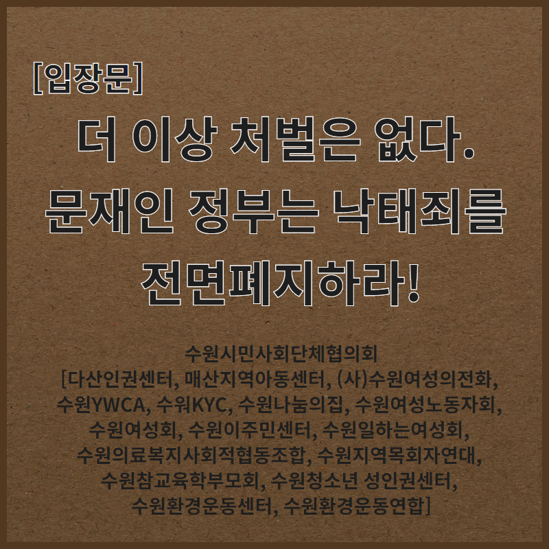 수원시민사회단체협의회는 낙태죄 전면폐지를 요구한다. 임신중지에 여성의 자기결정권을 존중하고, 의료 및 보건 접근성을 높이고 안전하고 합법적인 임신중단권을 보장해야 한다.