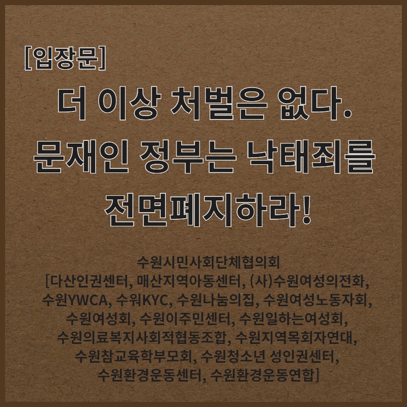 수원시민사회단체협의회는 ‘낙태죄 전면폐지’를 요구한다. 임신중지에 여성의 자기결정권을 존중하고, 의료 및 보건 접근성을 높이고 안전하고 합법적인 임신중단권을 보장해야 한다.