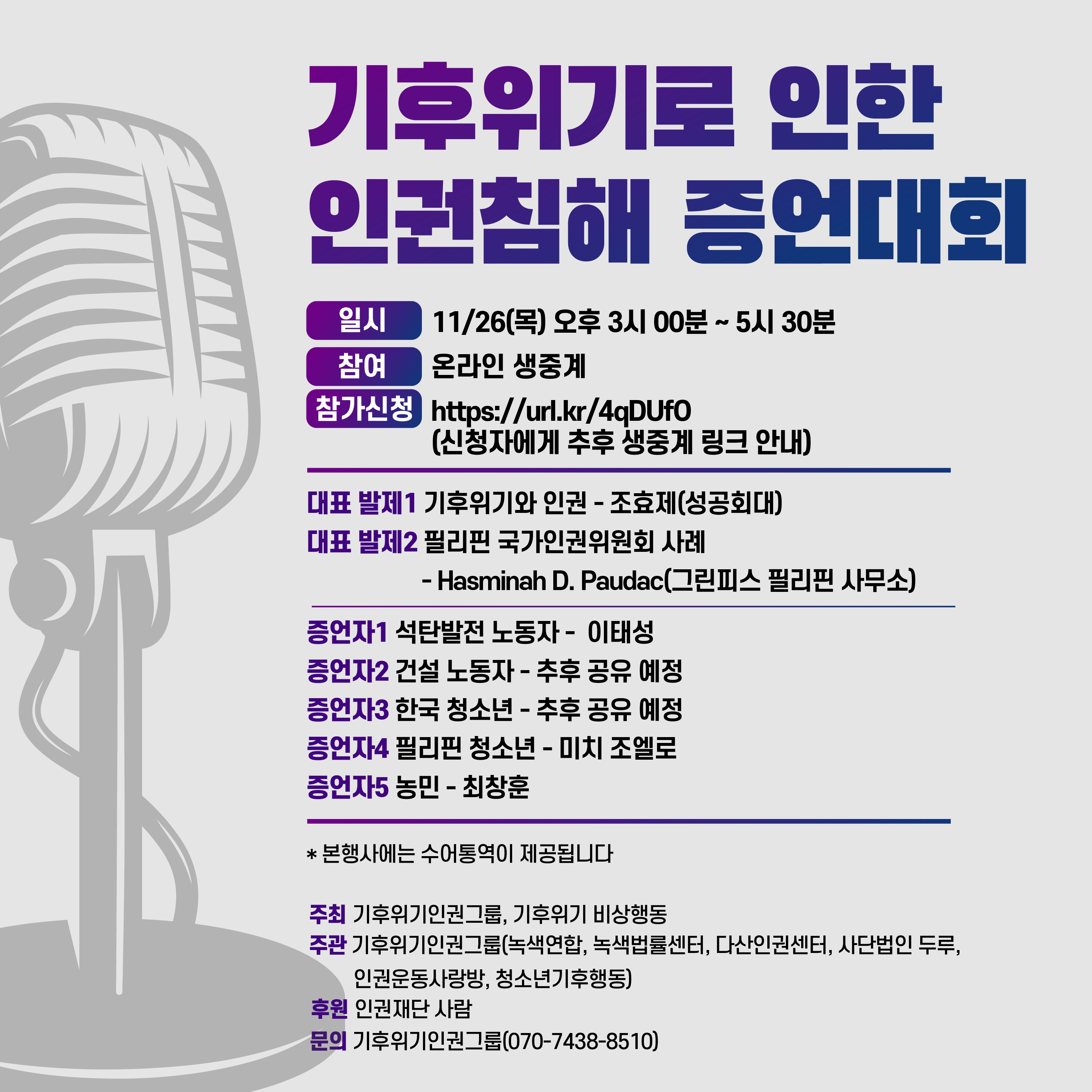 <기후위기로 인한 인권침해 증언대회> -일시: 11/26(목) 오후3시 ~ 5시 30분 -참여: 온라인 생중계 - 참가신청: 링크(신청자에게 추후 생중계 링크 안내) -대표 발제: 기후위기와 인권(조효제, 성공회