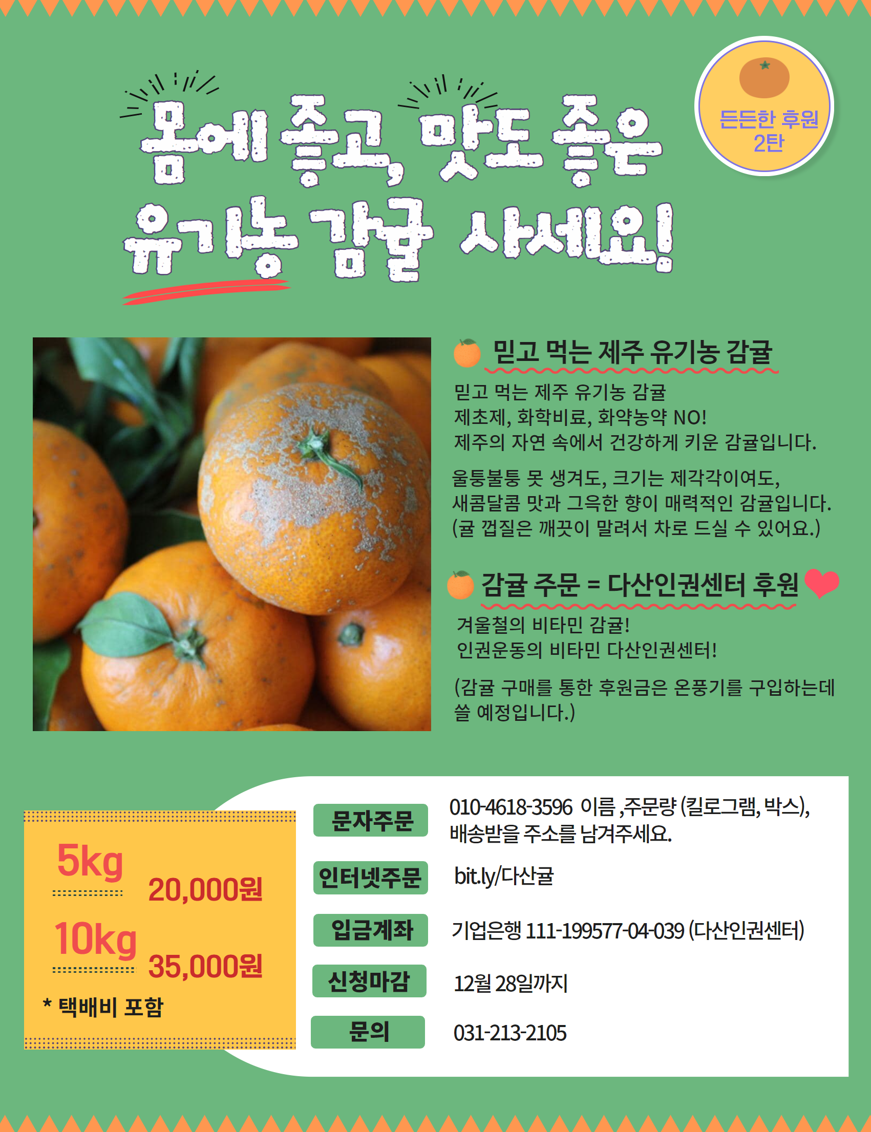 든든한 후원에서 두 번째로 판매할 농산물은 감귤입니다. 제초제, 화학비료, 농약 일체 사용하지 않고 키운 유기농 감귤로 겨울철 건강도 챙기고 다산인권센터도 후원하세요^^