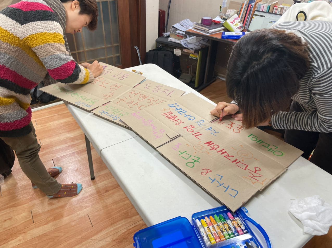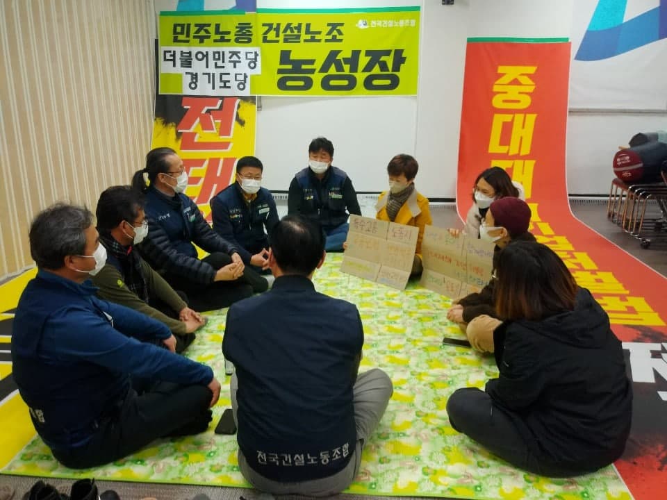 어제(11/30) 다산인권센터와 인권교육온다 활동가들이 더불어민주당 경기도당사에서 농성 중이신 건설노조 노조원들을 연대방문하였습니다. 방문 전 사무실에서 응원의 마음을 담아 손글씨 피켓도 만들었습니다.