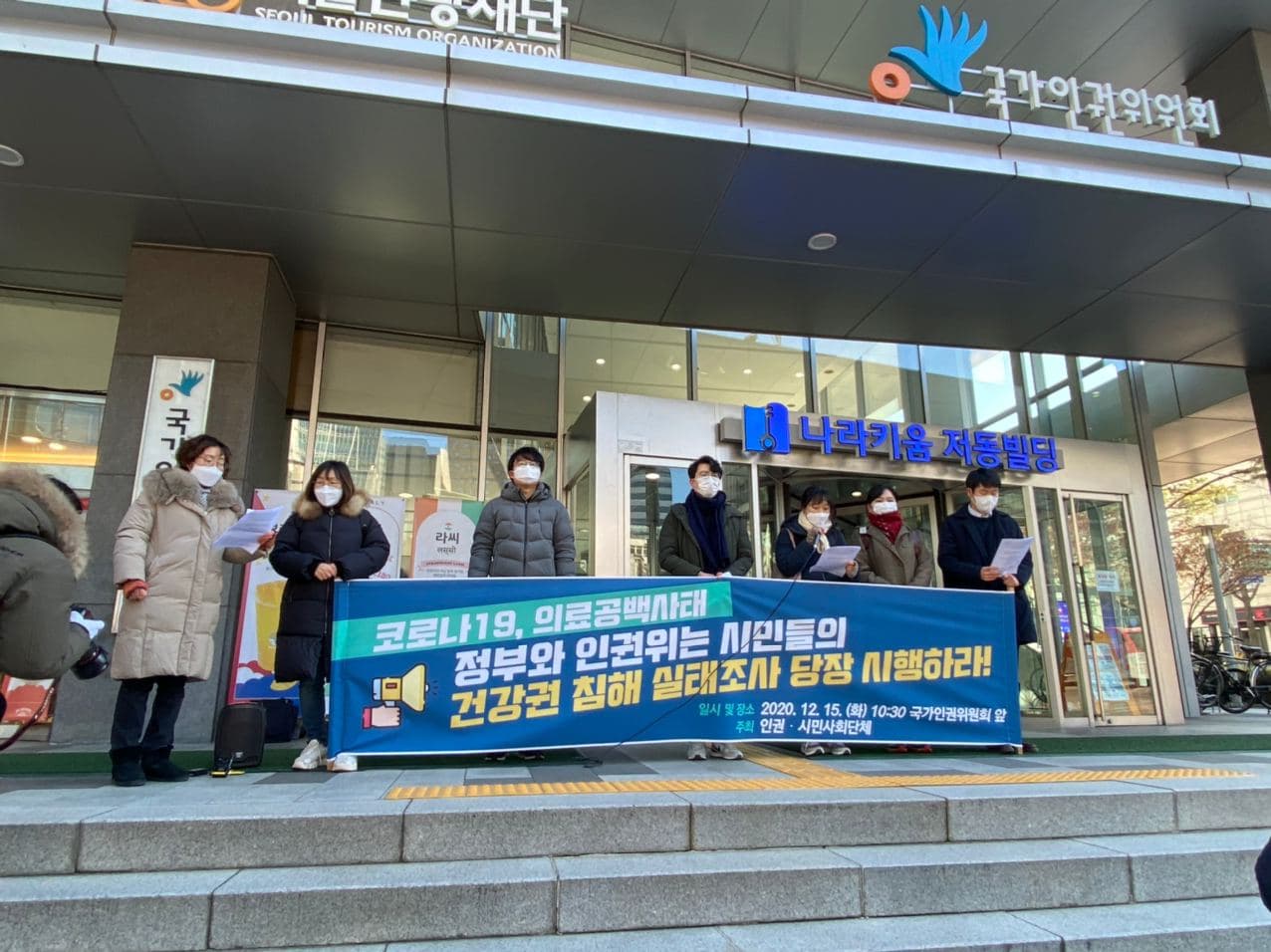 공중보건 위기상황에서 모두의 건강과 생명을 지키는 것은 국가의 의무이다. 감염에 대한 예방/치료뿐만 아니라, 모든사람들이 안전하게 치료/진료 받을 수 있는 환경을 만드는 것 역시 국가의 책임이다. 이는, 감염병에 대한 적극적인 대응에서 누구도 소외되지 않는 정책을 마련하는 것을 의미하며, 사회적 약자·소수자·취약계층에는 특별한 보호의 대책이 마련되어야 한다. 하지만, 10개월이 넘는 동안 공공의료 체계를 정비할 시간이 있었음에도 정부의 대책은 부재했고, 그로 인해 재확산이 되는 지금 시점에서 국민들의 생명과 안전이 위협당하고 있는 것이다. 이는, 모두의 존엄할 권리, 인권과 연결된 문제이며, 우리가 국가인권위 앞에 온 이유기도 하다.