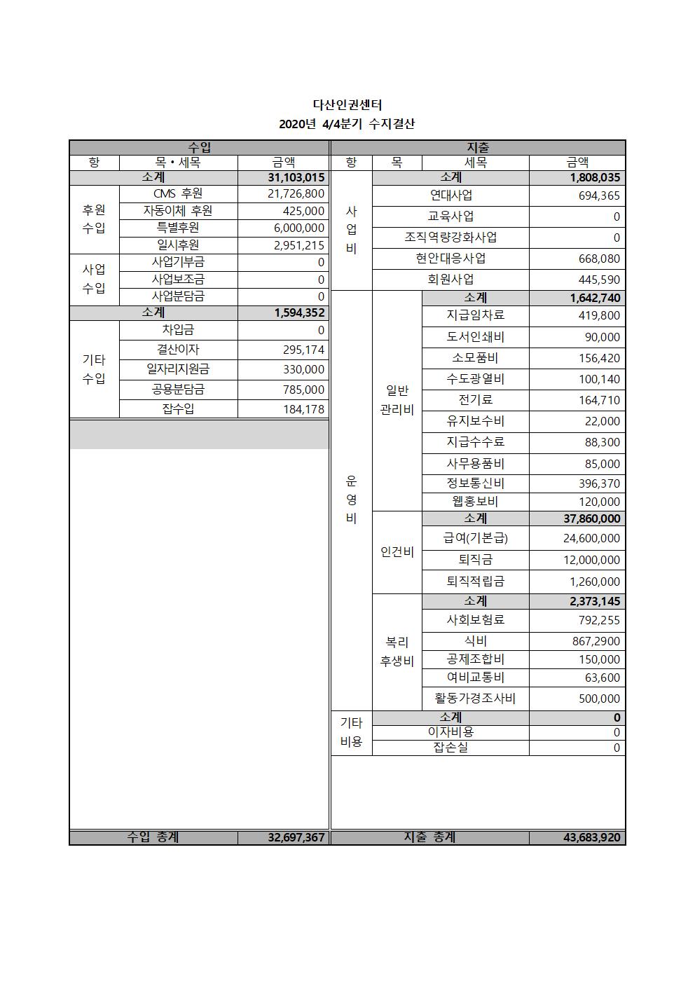 ★ 다산인권센터 2020년 4/4분기 수지결산