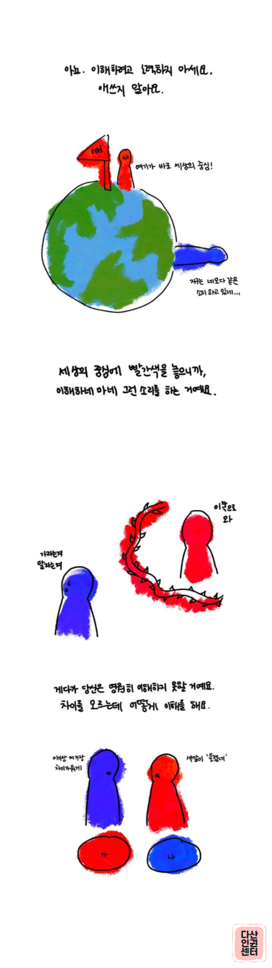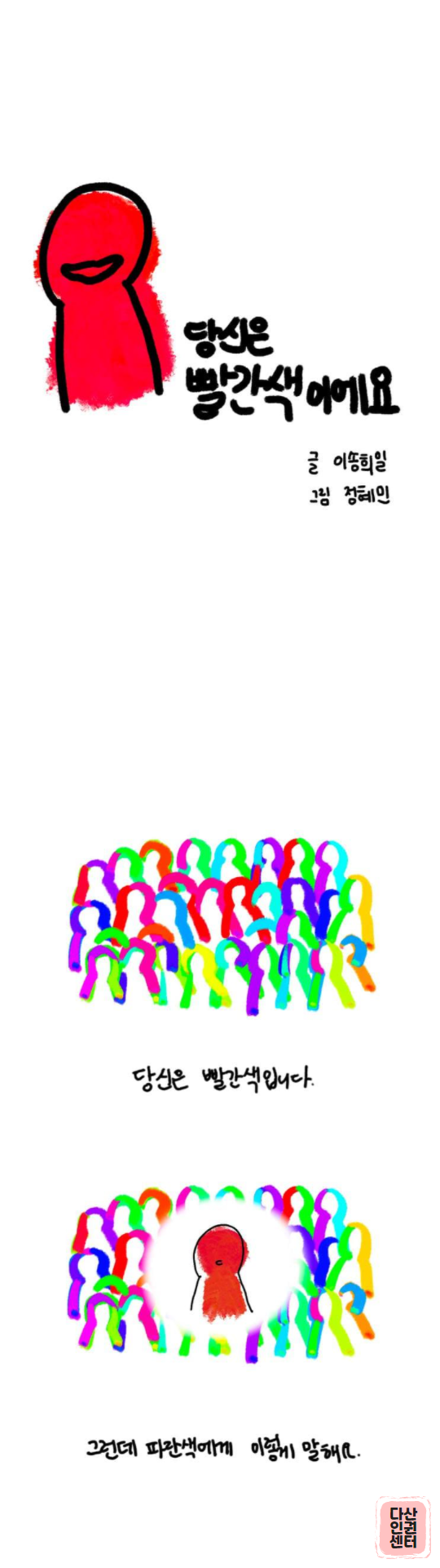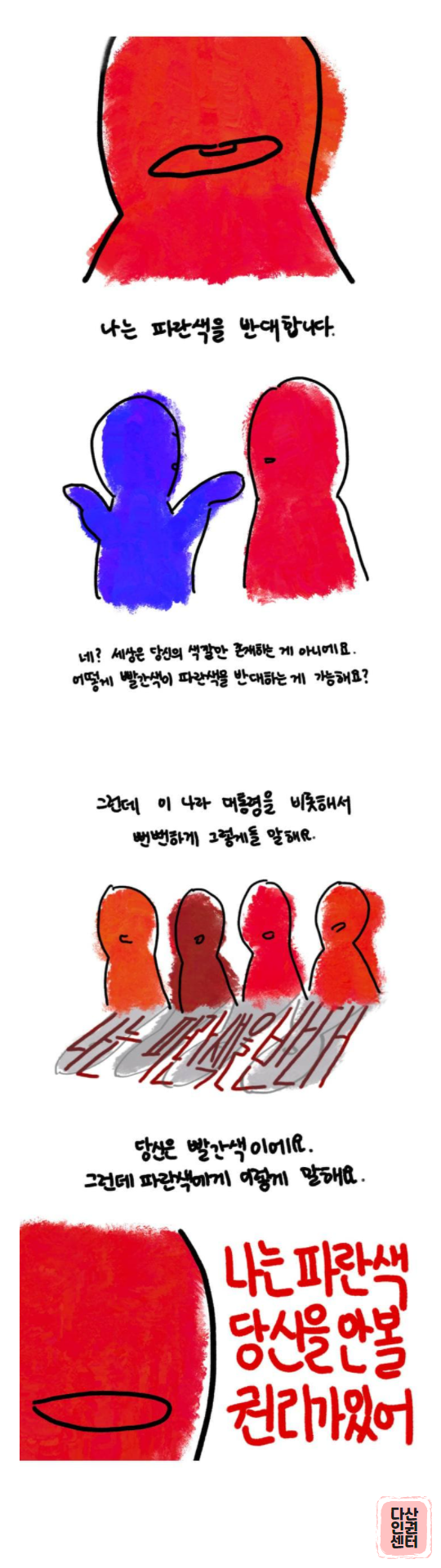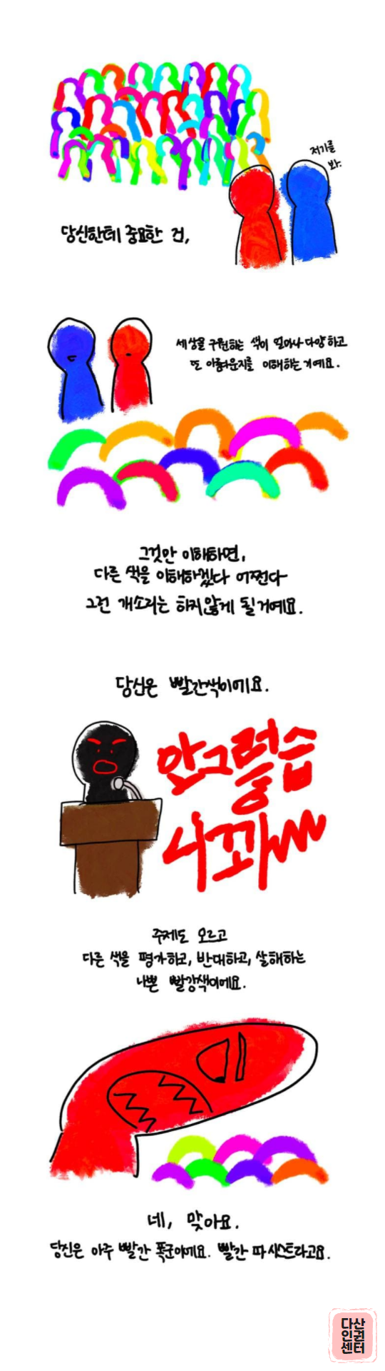 아래의 이송희일 감독님이 페이스북에 쓰신 내용에 땅콩(정혜민)님이 그림을 더한 만화입니다. 만화는 빨간색이 세상의 전부라고 믿고, 다른 색은 틀렸다고 믿는 누군가가 다른 색을 가진 사람들을 어떻게 대우하는지 그리고 있습니다. 며칠 전 군인으로 살고 싶다던 꿈을 접은 채 스스로 생을 마감한 변희수 하사님을 떠올리니 이 만화가 더욱 아프게 다가옵니다.