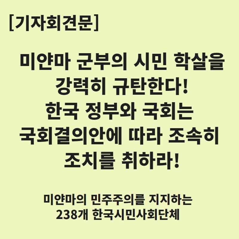 민주주의를 위해 긴 시간 피를 흘리며 싸워온 한국의 시민으로서, 엄혹한 시기에 국경을 넘은 연대의 소중함을 절박하게 느껴온 국제사회의 구성원으로서, 우리는 미얀마 시민들의 정당한 투쟁에 끝까지 연대할 것이며, 한국의 모든 정당과 정치지도자들이 이 문제에 대해 논의하고 대책을 마련할 것을 촉구한다.