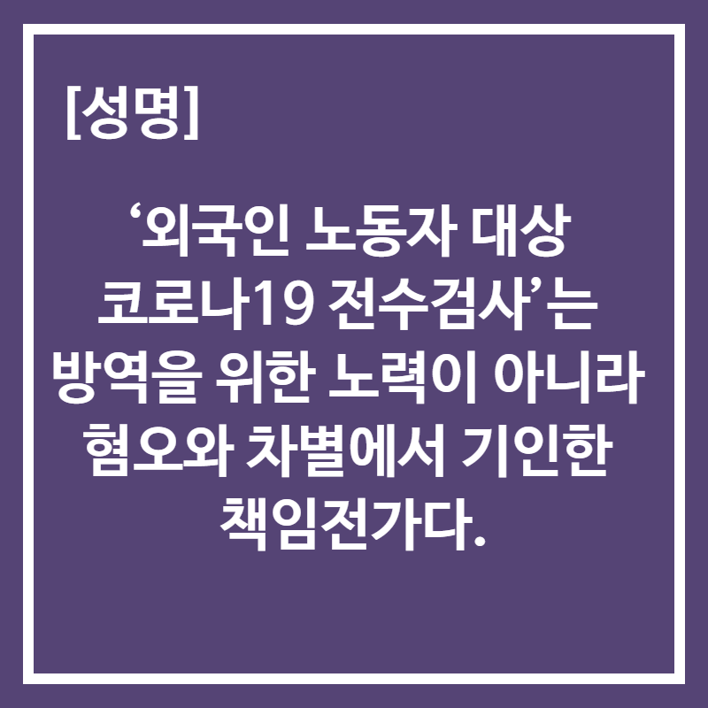 [성명]‘외국인 노동자 대상 코로나19 전수검사’는 방역을 위한 노력이 아니라 혐오와 차별에서 기인한 책임전가다.