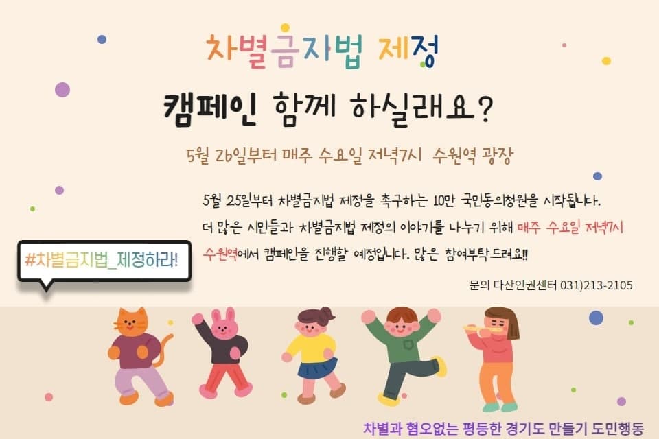 5월 25일부터 차별금지법 제정을 촉구하는 10만 국민청원을 시작합니다. 더 많은 시민들과 차별금지법 제정의 이야기를 나누기 위해 매주 수요일 저녁7시 수원역에서 차별금지법 제정 촉구 캠페인을 진행할 예정입니다. 시민들에게 차별금지법 제정의 필요성을 알리고, 현장에서 국민청원에 참여하도록 안내할 예정입니다.