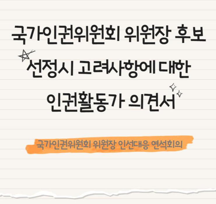 의견서에는 현 인권위에 대한 평가를 바탕으로 국가인권위원회 위원장 후보를 선정함에 있어서 중요한 잣대가 되어야 할 기준과 차기 위원장의 선정 기준, 국가인권위원회의 과제 등이 담겨 있습니다.