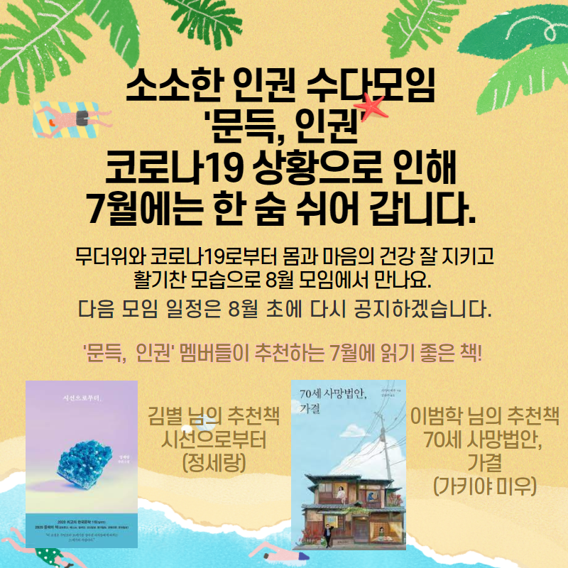 코로나19 상황이 심각해짐에 따라 7월에는 한 숨 쉬어가기로 결정했어요. 만나지 않는 대신 이런 때 읽기 좋은 가벼운 소설을 추천해 달라고 했더니 두 분이 추천을 해주셨네요.
