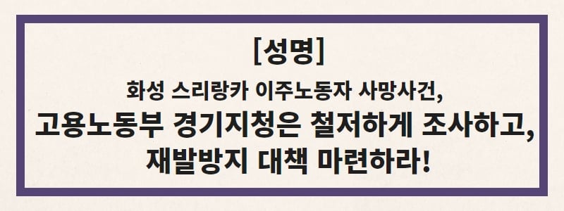 ‘죽음의 이주화’라는 말에 걸맞게 갈수록 높아지는 이주노동자 산재 사망률은, 이주노동자의 생존과 안전을 외면하고 있는 현실을 고스란히 반영하고 있다. 사건이 일어났을 때만 관심을 기울일 뿐 근본적인 대책과 대안 마련은 부재한 상황이다. 응급조치식 대책, 미약한 사업주 처벌은 또 다른 산재사고를 불러올 뿐이다. 언제까지 이주노동자들의 죽음을 이대로 방치할 셈인가. 고용노동부 경기지청은 이 사건을 계기로 경기지역의 이주노동자 고용사업장에 대한 안전 및 노동환경에 대해 철저하게 조사하고, 산재 예방을 위한 대책을 마련해야 한다.