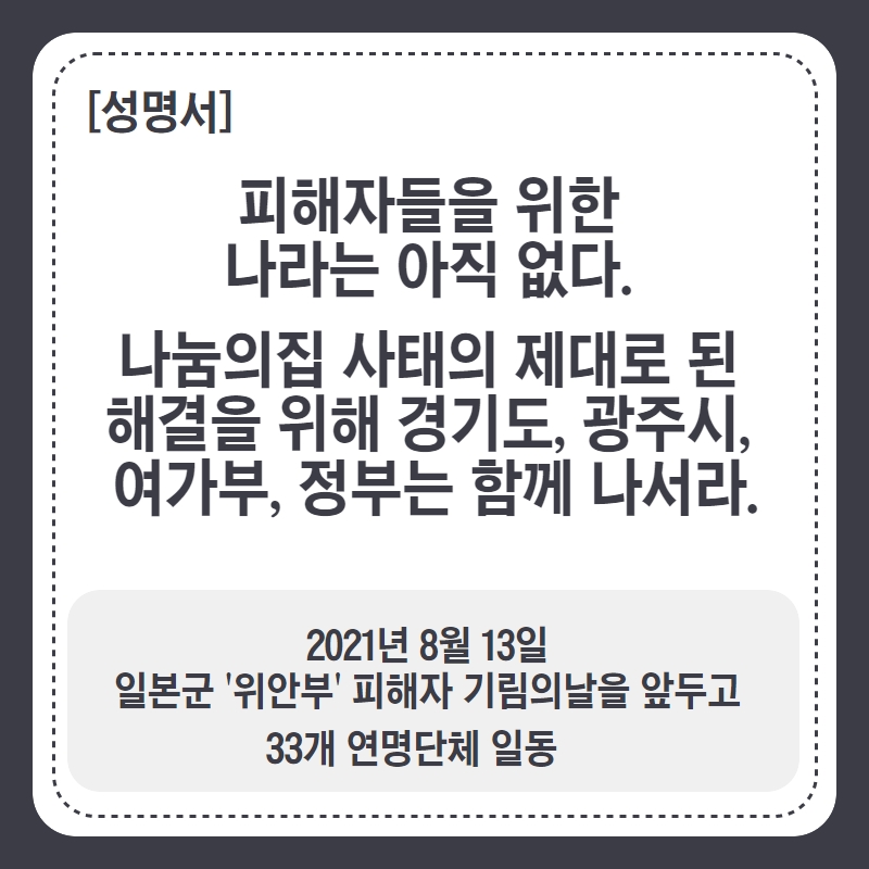 피해자들을 위한 나라는 없다. 여전히 없다. 그들을 지키고 보호하지 못했던 식민의 시절은 끝났지만 피해자들은 안전한가? 2021년 피해자들을 위해 책임있는 단 한명이라도 사죄하고 양심있는 태도를 보여야 마땅하다. 경기도, 광주시, 여성가족부, 정부가 나서서 이 사태의 책임을 지라. 피해자들을 위한 기림의 날은 기념하는 날이 아니라, 오늘의 피해자를 지키는 날이다. 당장 움직이라.