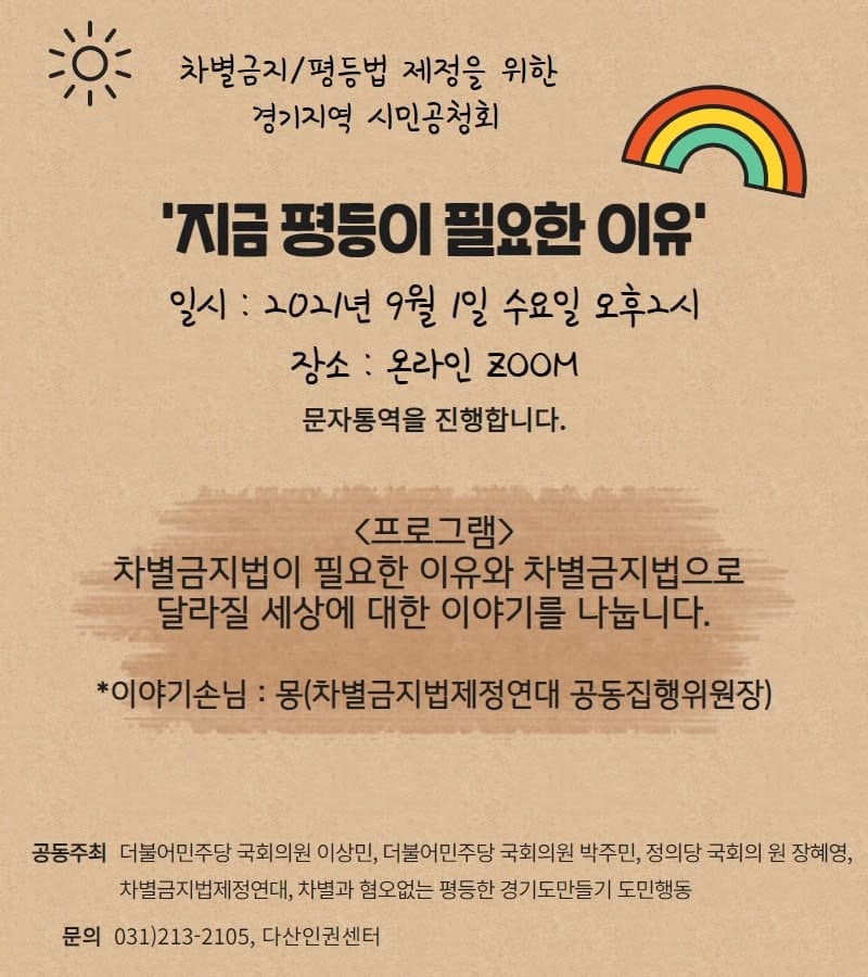 지난 6월 차별금지법제정을 촉구하는 10만 국민동의청원을 달성한 후 더불어민주당 이상민 의원과 박주민 의원이 평등법을 발의하였습니다. 이 흐름을 이어 전국의 시민들과 우리가 원하는 차별금지/평등법은 무엇이고 어떠한 방향으로 제정되어야 하는지를 먼저 토론하는 시민공청회가 8월 13일부터 9월 1일까지 전국 16개 지역에서 진행됩니다. 시민들의 목소리를 모아 9월에 정기국회에서 차별금지법/평등법 제정을 꼭 함께 이뤄냅시다.