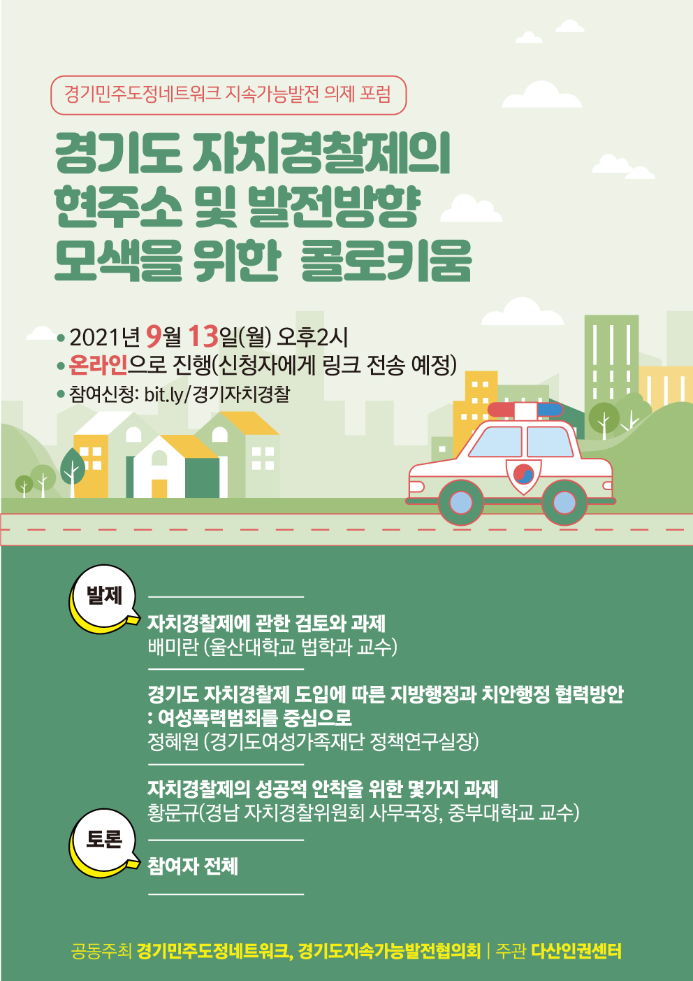 이에 현재 자치경찰제에 대한 콜로키움을 통해 경기도 자치경찰제의 현주소와 앞으로의 발전 방향을 함께 모색하려 합니다. 관심있는 모든 분에게 열려 있는 자리이니 많은 참여 부탁드립니다.