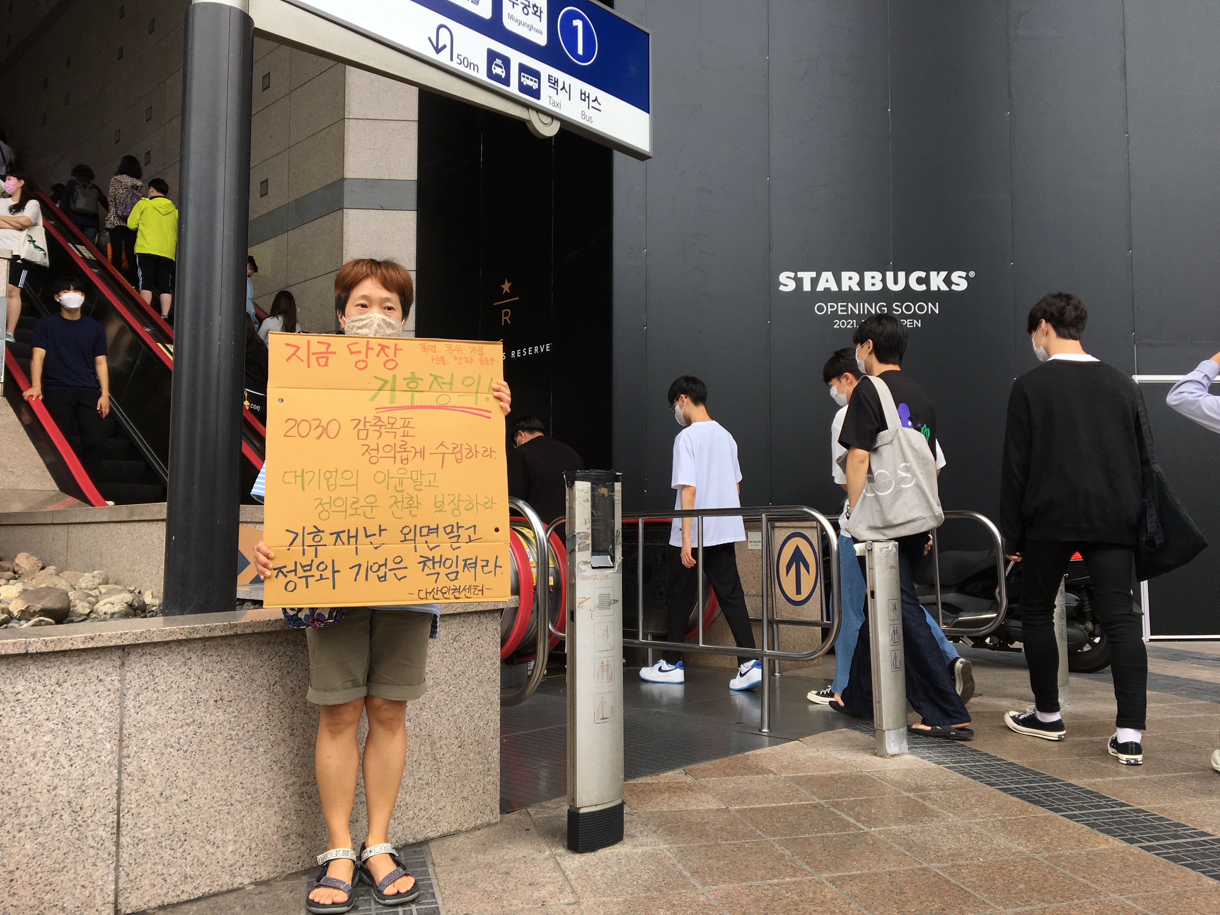 9월 25일 집중 기후행동의 날을 맞아 다산인권센터 아샤 활동가도 1인시위에 참여하였습니다. 수도권은 서울로 집중하라는 요청이 있었으나 사정상 수원역 앞에서 진행했습니다. 종이 박스를 재활용하여 피켓을 만들고 기후위기비상행동에서 공유한 슬로건을 적어넣었습니다. 시민들이 지나가면서 많이 보시더라구요. 좀 더 많은 시민이 현상황의 심각성을 공유하고 문제 해결에 함께 나섰으면 하는 바람립니다.
