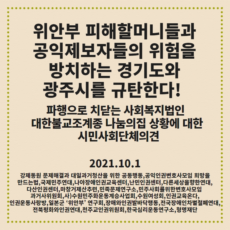 | [성명서] 경기도 광주시는 나눔의집 사태를 파행으로 몰고 가고 있다. (0) | 2021.10.07 |