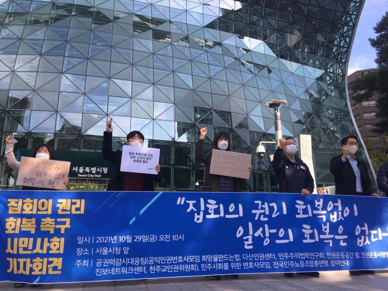 그동안 시민사회는 집회를 위험한 것으로 간주하고 일관된 원칙도 없이 집회.시위를 금지한 정부와 지방정부를 비판하며 안전하게 집회할 권리를 보장하라고 주장해 왔습니다. 하지만 이러한 시민사회의 의견은 이전에도 받아들여지지 않았고, 오늘 발표된 단계적 일상회복 이행계획에도 반영되지 않았습니다. 이에 집회의 권리 회복 없이 일상의 회복은 없다른 구호안에 방역조치로 가장 크게 제한된 집회.시위의 권리 회복을 요구하는 기자회견을 진행했습니다.