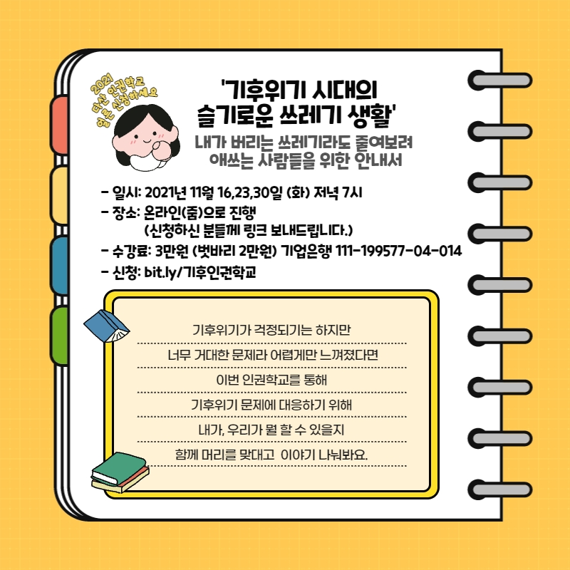 | [신청하세요!]인권학교 '기후위기 시대의 슬기로운 쓰레기 생활' (0) | 2021.11.02 |