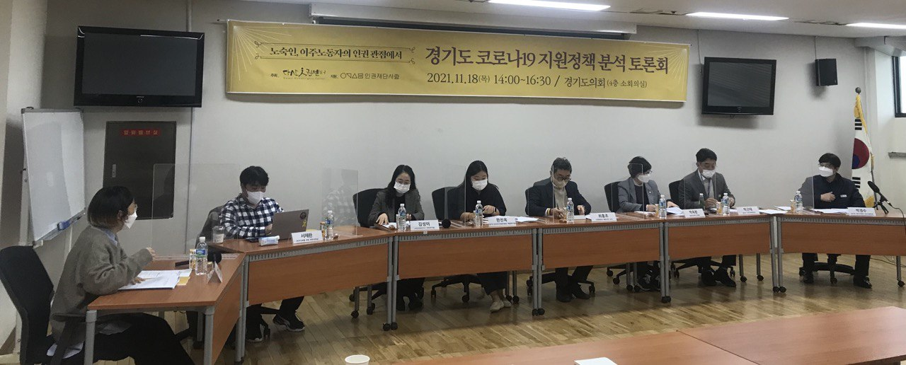 보고서를 더 많은 분들과 나누고자 <노숙인, 이주노동자 인권관점에서 경기도 코로나19 지원 정책 분석 토론회>를 11월 18일 경기도 의회에서 진행했습니다. 토론회에는 다산의 연구보고서 발표, 재난약자 지원조례에 대한 발표와 함께 경기도의원, 공무원, 시민단체 등이 지정토론으로 참여해주셨습니다. 재난 시기 사회적 약자들을 위한 제도개선과 정책 방향에 대해 논의하는 의미있는 자리로 진행되었습니다.