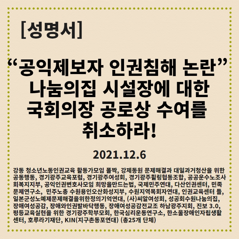 [성명서] ‘공익제보자 인권침해 논란’ 나눔의집 시설장에 대한 국회의장 공로상 수여를 취소하라!