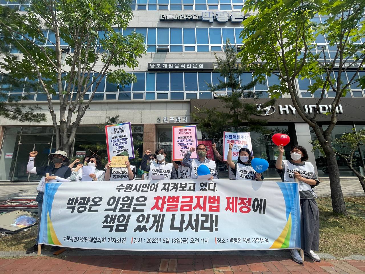 경기도민행동는 1) 국회 농성장을 찾아가겠다는 약속을 지키지 않은 박광온 의원은 사과하라. 2) 빨리 국회 공청회 일정을 잡고, 차별금지법 제정에 책임 있게 나서라. 이 두 가지 요구를 내 걸고 박광온 지역사무실에서 농성을 진행한 지 하루가 지났습니다. 지역 시민들의 절박한 농성에 5월 12일 오전 박광온 의원이 지역사무실을 방문해 면담을 진행했습니다.