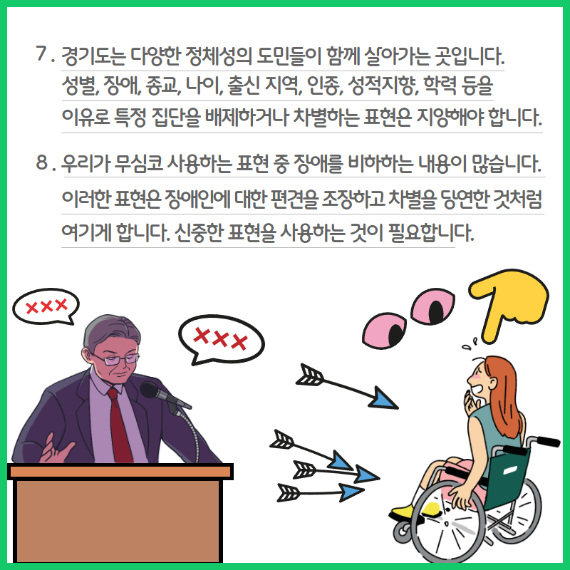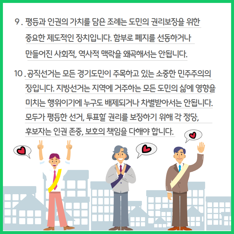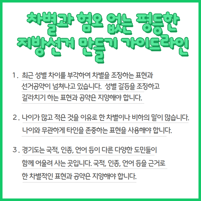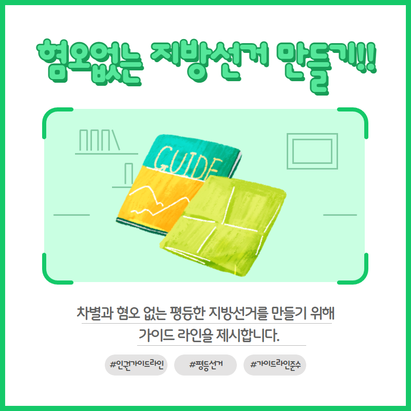 선거는 국민의 권리행사의 가장 기본적인 수단이며 민주주의를 실현하는 장입니다. 다양한 정치적 견해가 오가고, 사회구성원들이 참여하는 자리이기에 인권을 존중하고 평등하게 진행되어야 합니다. 공약, 정책 등은 인권을 기본으로 하여 수립하고, 선거기간 표현 역시도 평등하고 신중해야 합니다.